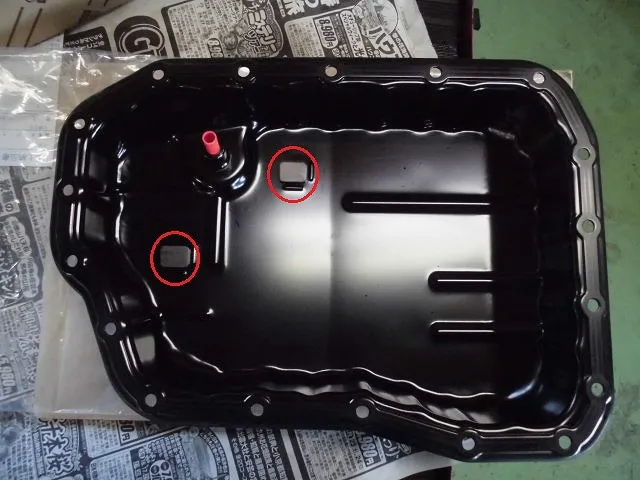 清掃後のATオイルパンとAT本体(ストレーナは新品)です。ATオイルパン画像の赤丸がマグネットで、ストローのような赤い筒がオーバーフロープラグです。エンジンをかけた状態の規定油温で、オーバーフロープラグ一番上までが規定油量となります。