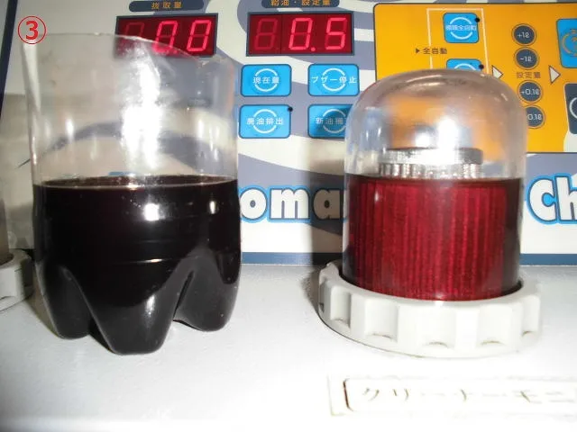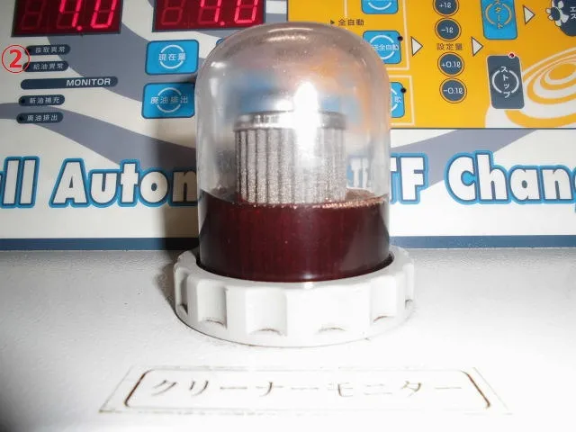 1回目は、抜き取った量のATオイル分を補充してのクリーニングなので、ほぼ旧油の状態です。2回目は、7.0リットル圧送交換後のクリーニングモードで、ATオイル越しにフィルターが見えてきました。