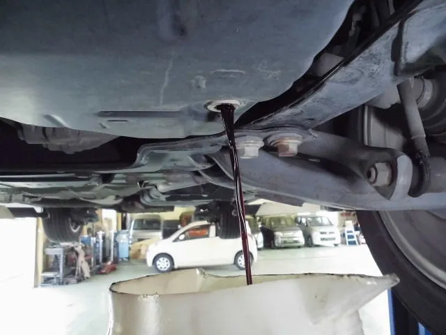 当社独自のAT/CVT入庫診断で問題はなかった事をお客様と一緒に確認し、オートマチックオイル交換作業へと移ります。まずは、オーバーフロープラグまで外しオイル抜き取り。結構汚れてますね。