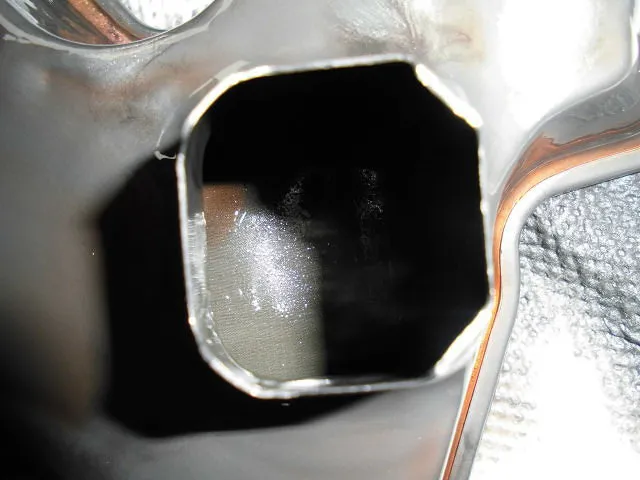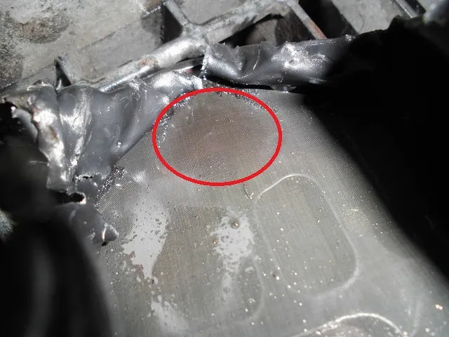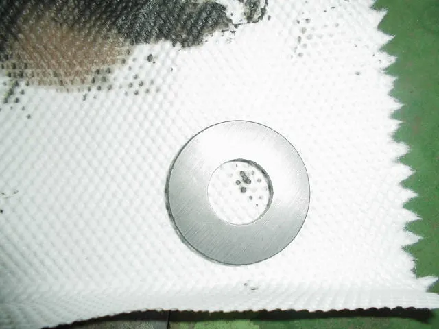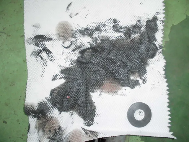 左の画像は、ストレーナのオイルパン側を切り開いた写真です。赤丸の部分がオイルパンから吸い上げられたATオイルの圧が一番強い部分になり、その付近にはしっかりと食い止められた鉄粉の痕跡が!!