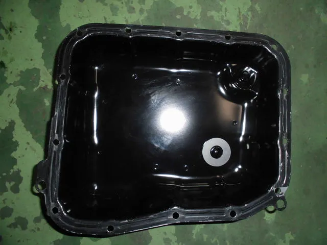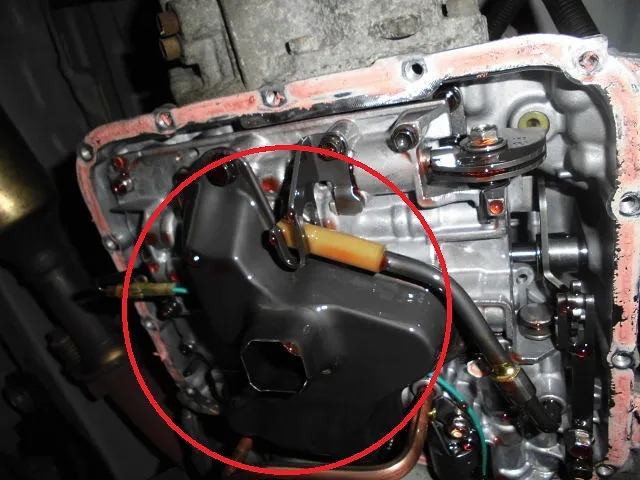 オイルパンの画像の赤四角の部分は私が指で触った所です。指の跡が付くほど汚れてます。左画像のオイルストレーナに四角く空いてるところからATオイルが吸い上げられ、ストレーナ内部のフィルターでスラッジ及び鉄粉等を除去し各部に送られます。