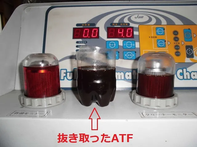 抜き取った分より少し多めにATオイルを補充。トルコン太郎を設置し、ATオイルの状態をチェックしたら思っていたよりオイルの汚れが無いので、そのまま1回目のクリーニング!!