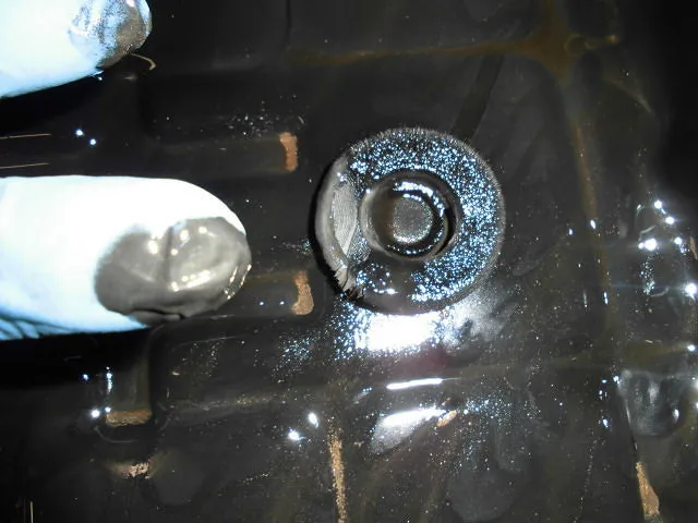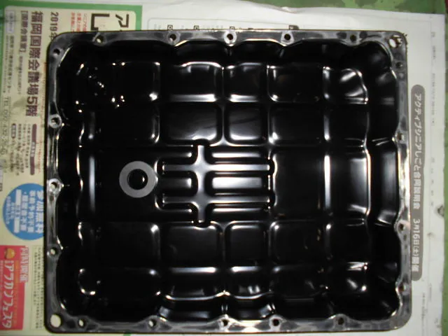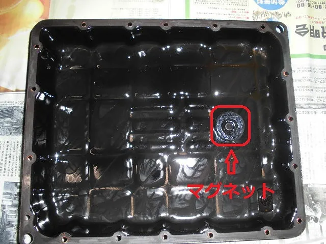 清掃後、マグネットをオイルパンの定位置に置き完了!! こんなに奇麗になるのです。ストレーナは新品に交換です。本体側も出来る範囲で清掃してます。