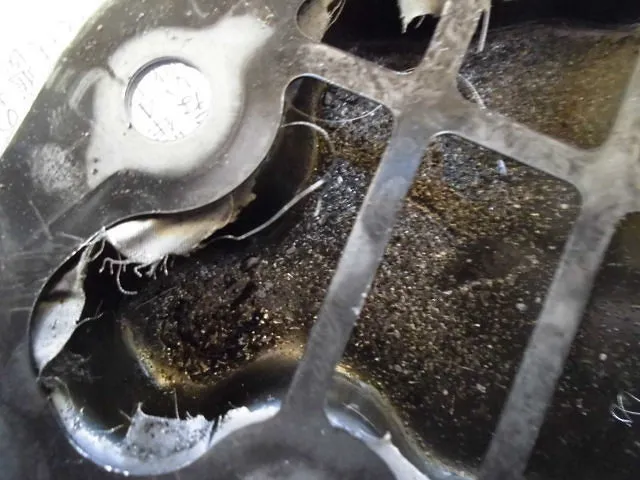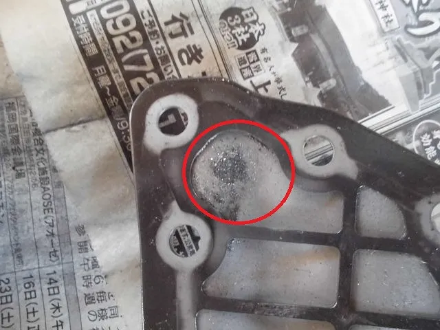 オートマチック内部の部品から出た汚れと鉄粉です。35万km超走っているので、マグネットに鉄粉が「もうこれ以上くっつかないかも」っていうくらい逆立ってくっついています。オイルパンのプレスラインの溝に汚れと鉄粉がたまってます。異常な鉄粉はなかったので、作業は続行となりました。でもここまでたまっているとストレーナの状態が気になり検証して見ました。左上画像の赤丸部分がバルブボディに吸い上がる一番圧の強くなる所で鉄粉がフィルターの目をかいくぐってます。こうなるとATに不具合が出て来てもおかしくないのでしょう。右上画像は、フィルターを破った写真です。かなりの鉄粉がたまってます。定期的にオートマチックオイル交換は必要で、10万km過ぎると一度はストレーナ交換もやるべきだと思いました。