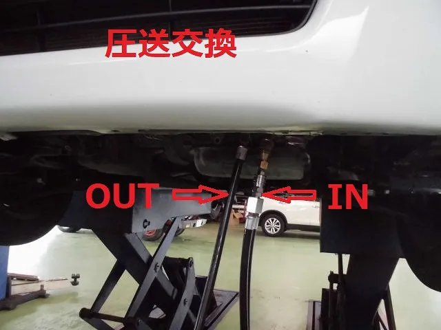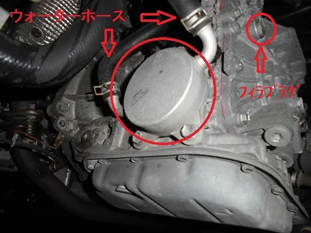 大きな赤丸のパーツがCVTオイルクーラーで、CVT本体に取り付けられておりトルコン太郎のホースを繋ぐことが出来ません。矢印のホースは、ウォーターホースでエンジンの冷却水が流れています。このままでは、トルコン太郎で圧送交換も循環交換も出来ません。そこで、圧送交換をする為にオイルクーラーを外して特殊工具(アタッチメント)を取り付けます。このようなタイプの車が多くなり、AT/CVTオイルを簡単に交換できなくなりました。オイルゲージもないのでオイル量調整も結構シビアです。