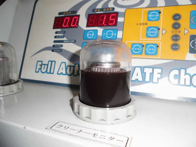 全容量6.3リットルに対し交換容量は8.0リットルに設定しました。なぜかと言うと、圧送交換中に旧油と新油がCVT/AT本体の中で混ざるからです(トルコン太郎の中では混ざりません)。なので当社は、1.5~2.0リットルプラスで圧送交換してます。この後は、規定油温でCVTオイルの調整をして走行テストで完了です。