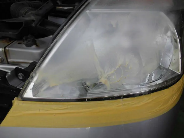 まずは、耐水ペーパー中目でレンズを磨くと言うより削ります。画像の黄色い部分がレンズの汚れ・黄ばみです。この磨きの第一工程が一番大事で、黄ばみが出なくなるまでしっかり削ります。この工程が終わると下の工程へと移ります。