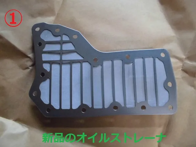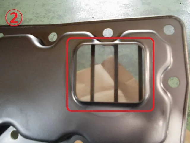 ②は①の裏側でオイルパン側になります。赤四角の部分からオートマオイルが吸い上がっていきます。