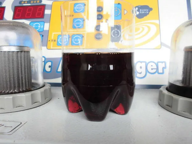 まず、オイルパンにたまっているオートマチックオイルをオイルドレンより抜き取り。約3リットル抜けました。右の画像が抜き取ったオートマチックオイルです。トルコン太郎のパネル上のフィルターの横に置いて撮ったので、凄く汚れて見えますが総走行距離を加味すると驚くほどではないです。ここまでオイルパンを外すことなく、オートマチックオイル交換だけでオートマチックに不具合が出なかったのも、トルコン太郎で圧送交換ときちんとクリーニングしてきたからでしょう。恐るべしトルコン太郎!!
