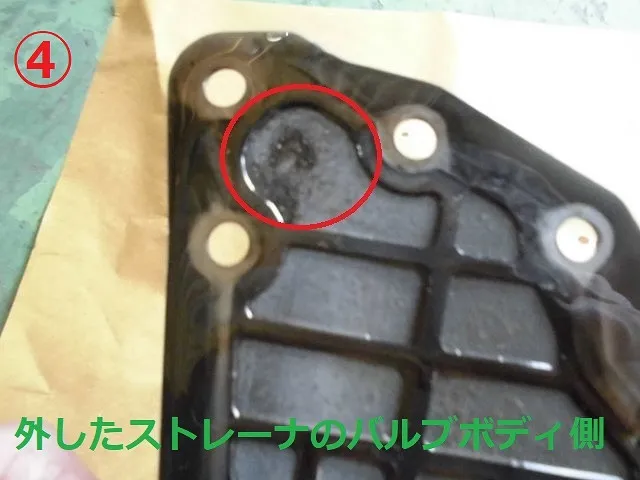 ④の赤丸の所がバルブボディにオイルが吸い上がる力が一番かかる場所なんでしょう。少し鉄粉がメッシュ部を抜けてきてます。