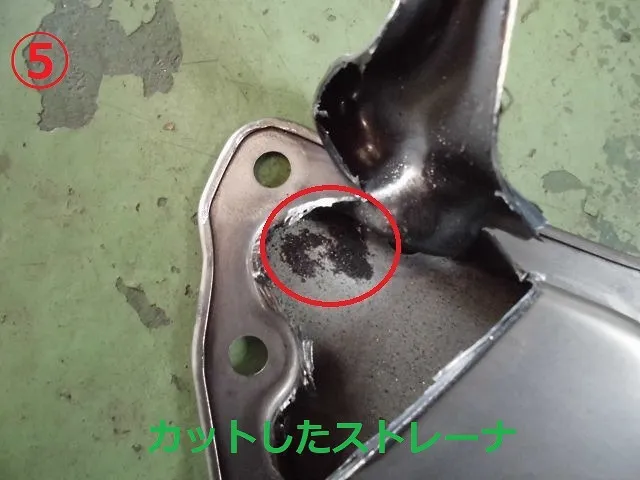 ⑤は④の反対側でストレーナをカットしてみました。鉄粉がかなり溜まっていて全体にもまばらに鉄粉が付いてます。